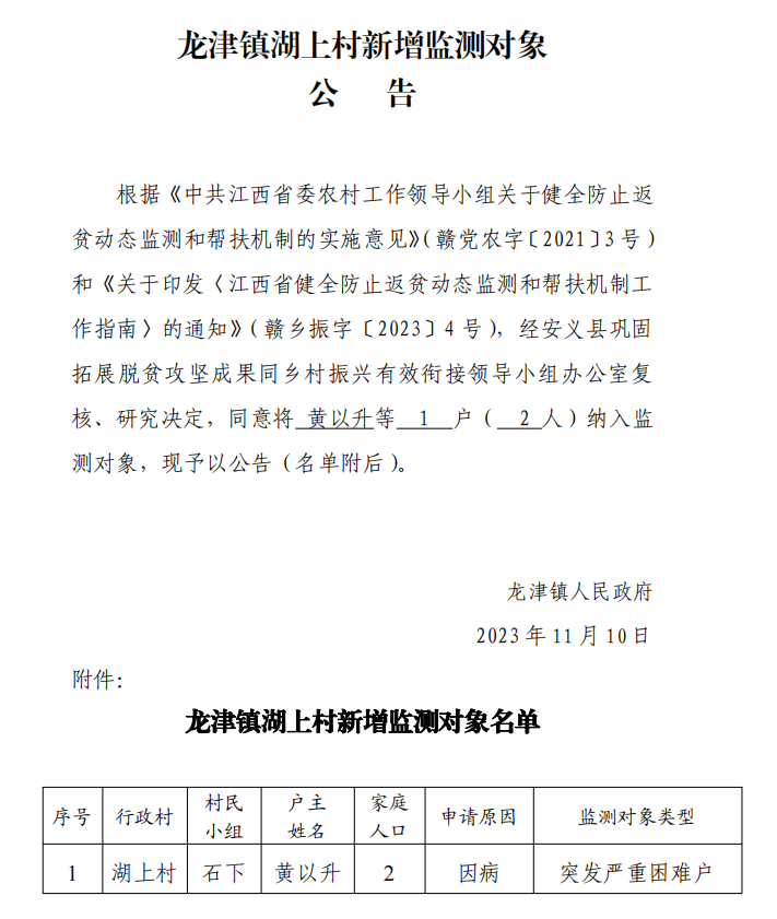 龙津镇湖上村新增监测对象公告