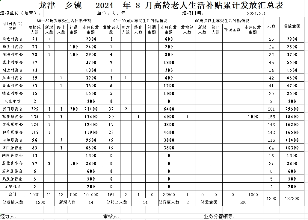2024年8月份龙津镇高龄老人生活补贴累计发放汇总表