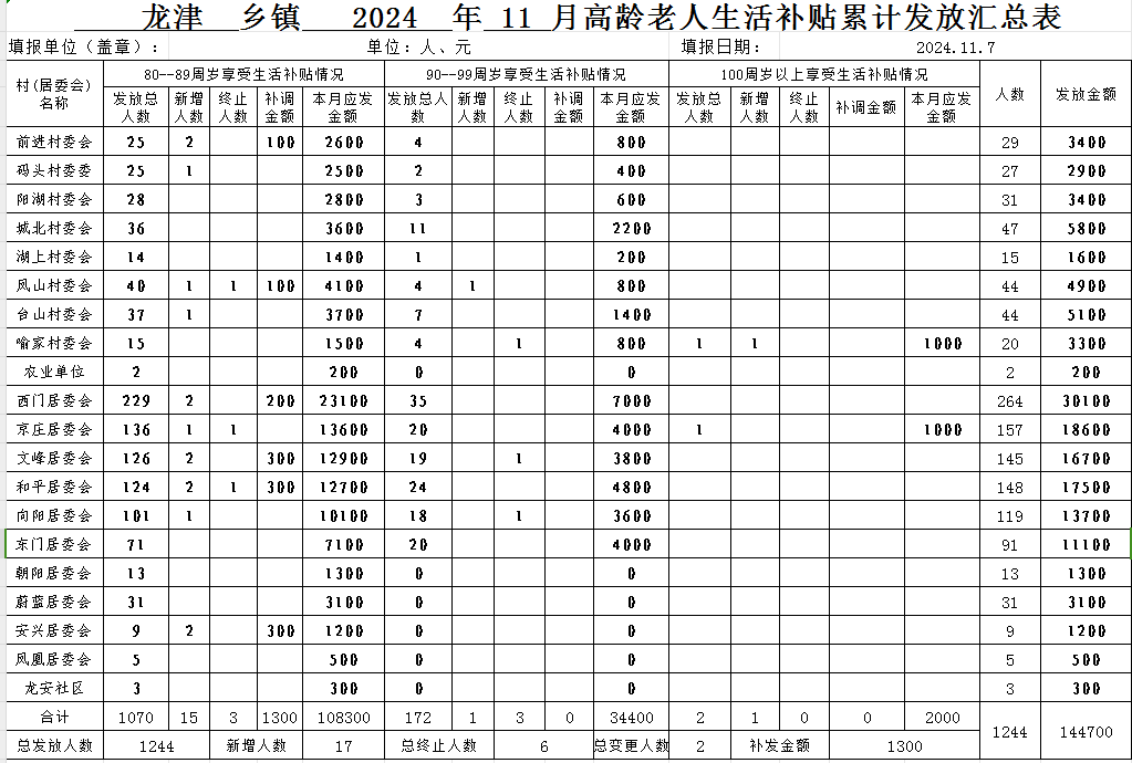 2024年11月份龙津镇高龄老人生活补贴累计发放汇总表