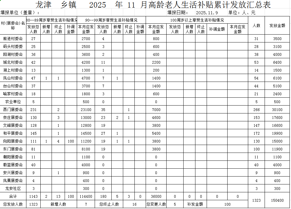 2025年11月份龙津镇高龄老人生活补贴累计发放汇总表
