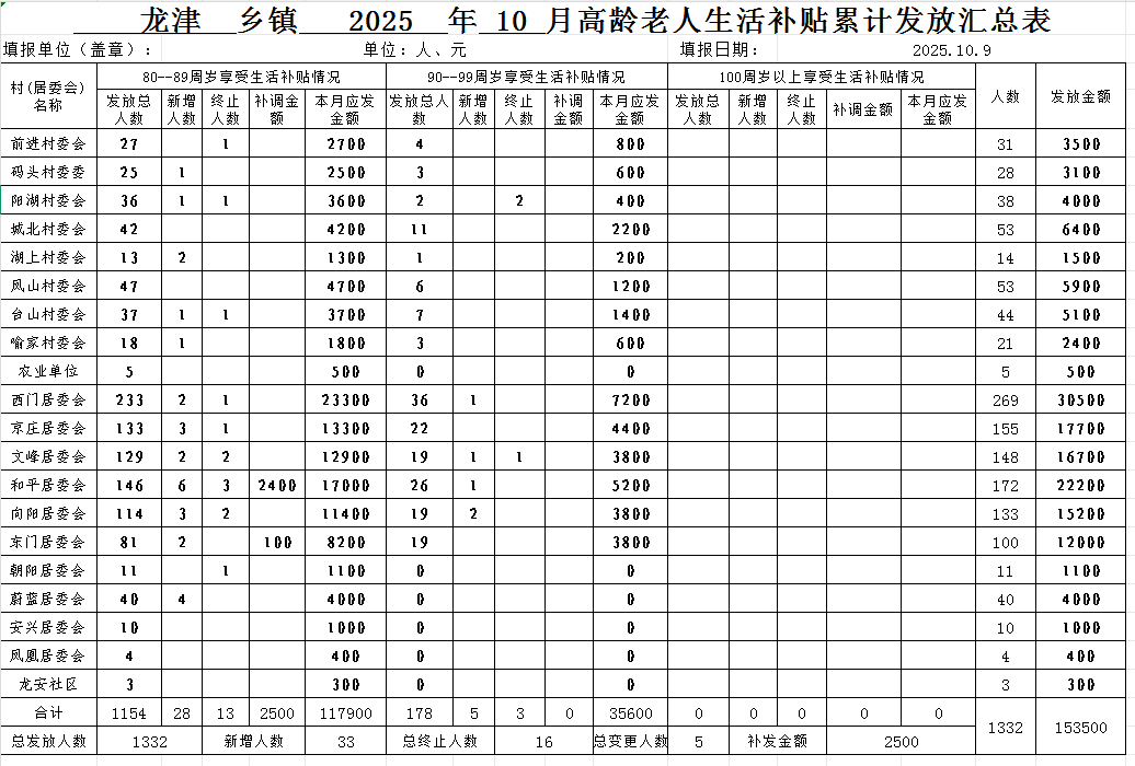 2025年10月份龙津镇高龄老人生活补贴累计发放汇总表