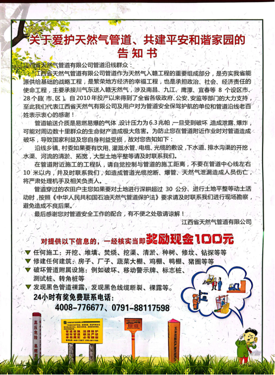 爱护天然气管道、共建平安和谐家园,保护管道,人人有责! 对提供以下信息一经核实奖励100元(举报电话:4008-776677):
