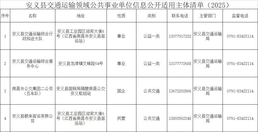 安义县交通运输领域公共事业单位信息公开适用主体清单(2025)