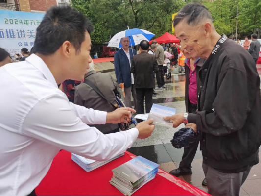 为进一步提高群众对水生态环境保护的认识,鼓励各界人士和人民群众参与到美丽中国建设中来,县水利局围绕河道采砂、河湖长制、取水许可审批、农村安全饮水向群众发放《中华人民共和国长江保护法》《江西省中小学河湖保护教育读本》《江西省取水许可和水资源费征收管理办法》和农村饮水安全须知等宣传资料共计60余份,制作宣传展板1块。水利局普法人员现场向群众解答有关河湖保护和用水安全知识。