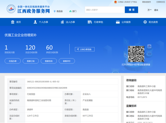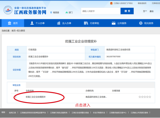 5.我们选择“优强工业企业倍增奖补”事项,点击进入,可以看到事项的政策内容,再次点击“审批业务”栏目的“ 优强工业企业倍增奖补”进入办理页面。