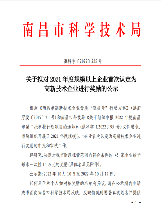 关于拟对2021年度规模以上企业首次认定为高新技术企业进行奖励的公示