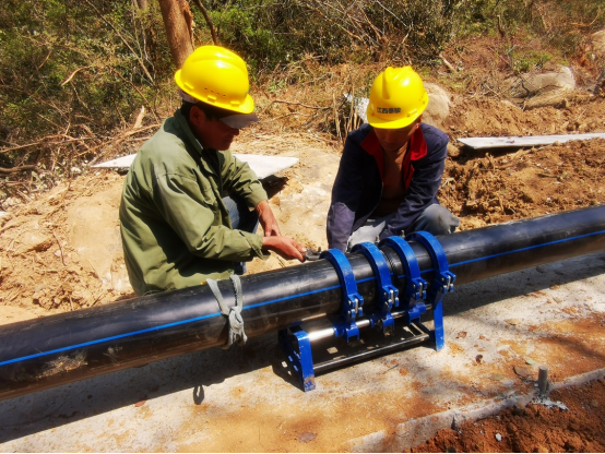 4月14日,在乔乐乡林场的山道上,施工人员正在紧张地焊接输水管道,回填沟槽。这是安义县城乡统筹供水保障项目在该乡的一个施工现场。