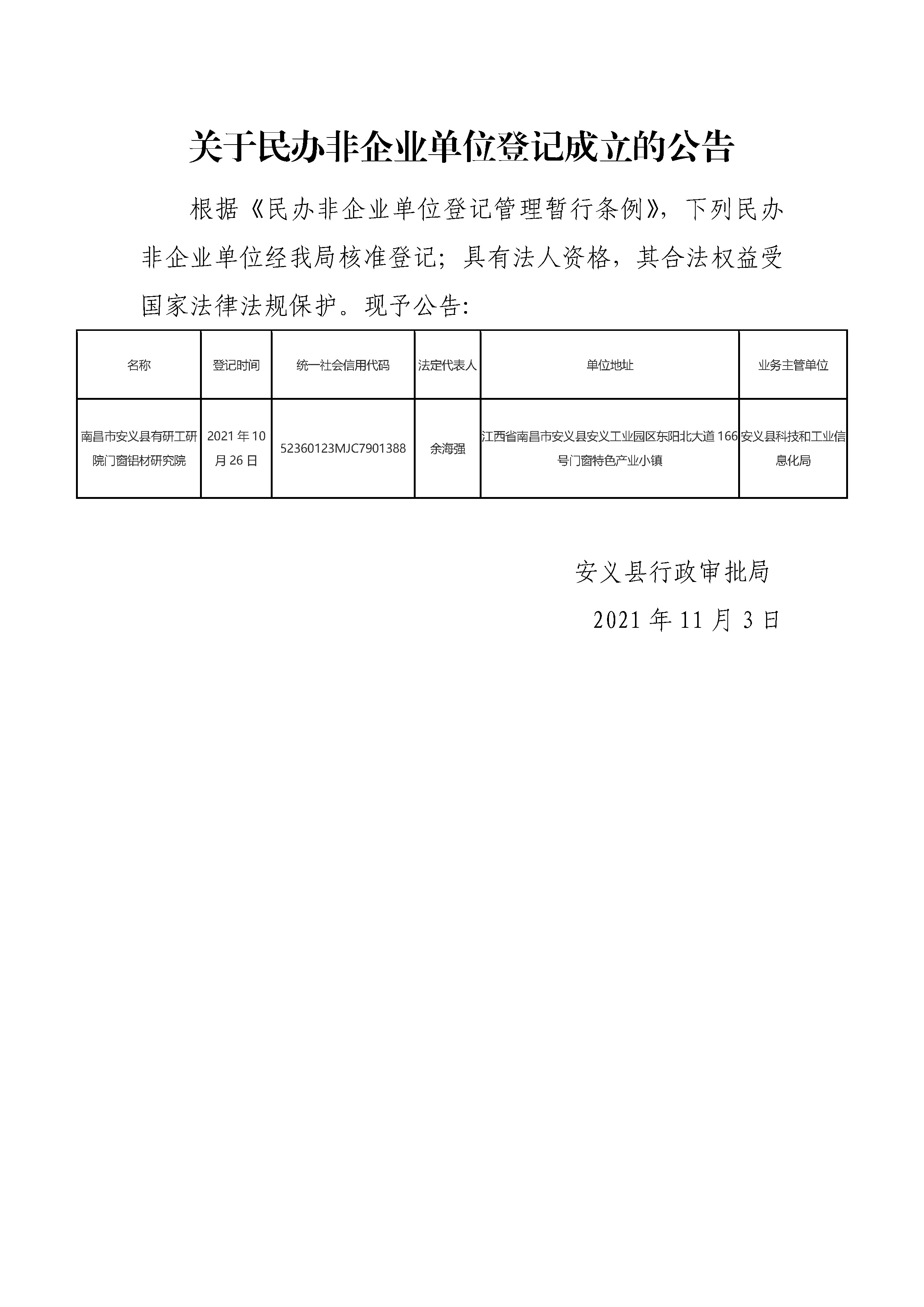 关于民办非企业单位登记成立的公告