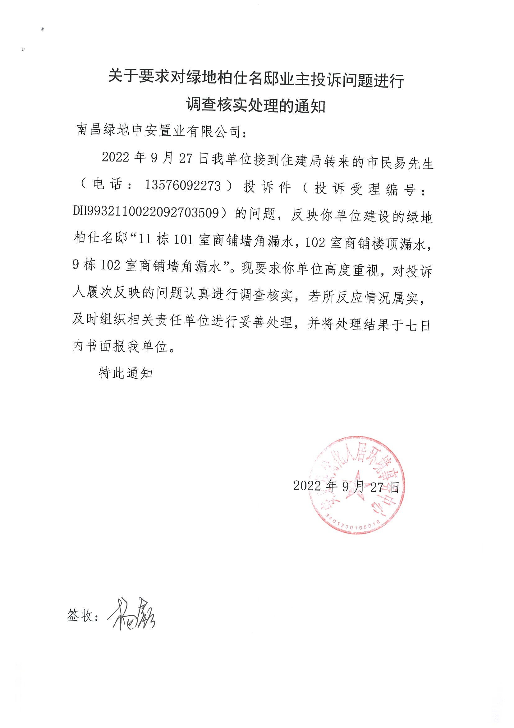 关于要求对绿地柏仕名邸业主投诉问题进行调查核实处理的通知
